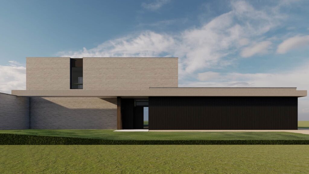 Le projet allie sobriété volumétrique et rigueur constructive : jeux d’horizontales, façades rythmées par des matériaux contrastés (béton brut, bardage bois sombre, menuiseries aluminium).